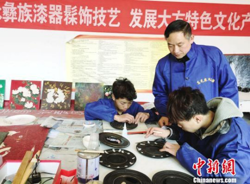 “大方彝族漆器髹飾技藝”貴州省級非遺代表性傳承人高光友指導(dǎo)學(xué)徒制作漆器。 從生漆收割、胎坯制作到漆器形成,全部50多道工序、80多個生產(chǎn)環(huán)節(jié),都需手工完成。其中,純大漆和皮胎等工藝是大方漆器所獨有。