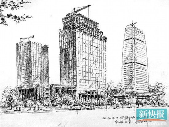 “以前工作日需要上班,我就利用周末在街巷間走動,看到地標建筑就開始畫。遇到正在施工的高樓,我就計算著日子,到高樓即將封頂?shù)臅r候,我就帶上紙筆到施工現(xiàn)場畫畫?!眳橇⒅薪榻B。