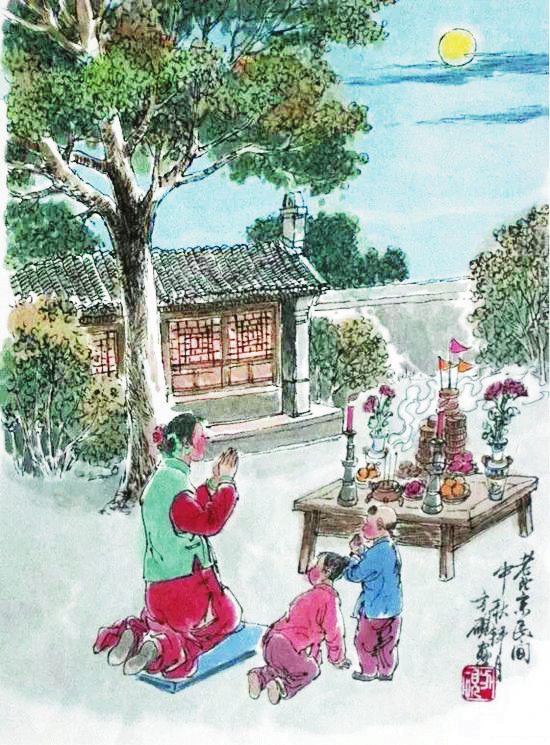 “中秋月。月到中秋偏皎潔?!辟p月是中秋節(jié)的重要習(xí)俗,我國民間的中秋賞月活動約始于魏晉時期,盛于唐朝,當(dāng)時許多名篇佳作中都有詠月的詩句。北宋時期,以賞月活動為中心的中秋節(jié)已成為普遍的民俗節(jié)日,然而與唐代不同的是,宋代關(guān)于賞月的作品多是感物傷懷,以陰晴圓缺喻人情世態(tài)。宋代的中秋夜是不眠之夜,夜市通宵營業(yè),游人絡(luò)繹不絕,《東京夢華錄》中載:“中秋節(jié)前,諸店皆賣新酒,貴家結(jié)飾臺榭,民家爭占酒樓玩月,笙歌遠(yuǎn)聞千里,嬉戲連坐至?xí)浴!币恍┑胤缴踔亮鱾鳌爸星镆乖酵硭介L壽”的說法,于是有了守夜的習(xí)俗。守夜時,家里長輩通常會給小孩講關(guān)于月亮的故事,如嫦娥奔月、吳剛伐桂等,孩子們個個聽得津津有味。