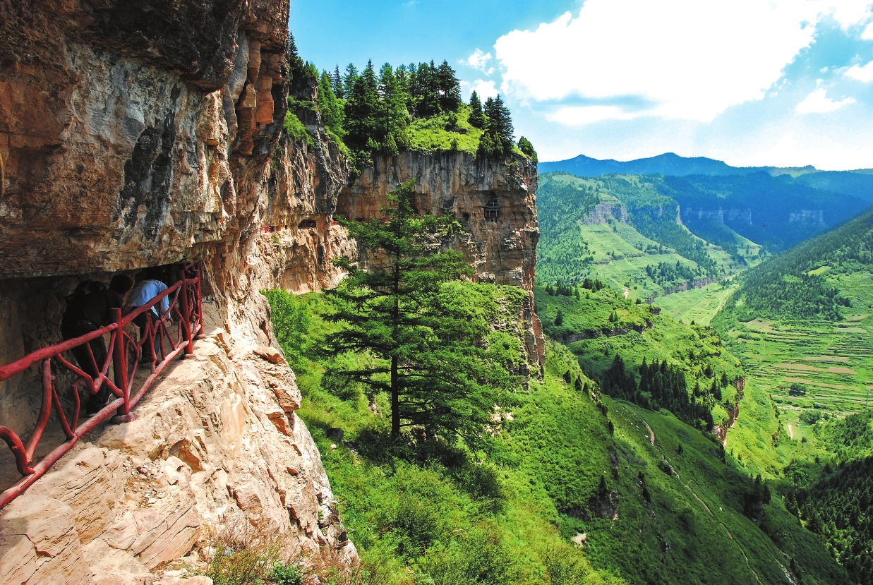 懸崖棧道位于寧武縣清真山,屬額狀丹霞巖地貌,由唐代貞元年間始建的佛教懸空古剎群與棧道共同構(gòu)成。棧道原長(zhǎng)42華里,現(xiàn)有修復(fù)段5華里及羅漢殿、毗盧殿等建筑群,其中羅漢殿“回聲階”屬全國(guó)五大回聲建筑之一。懸崖棧道的攀爬較為艱險(xiǎn),需要兩個(gè)小時(shí),途中要攀登懸崖、臺(tái)階,還要穿越僅可容一人通過的山間隧道。