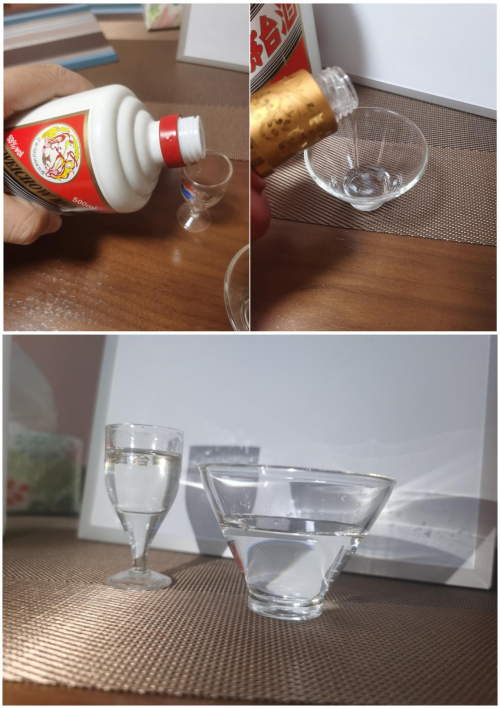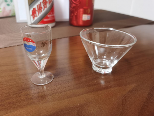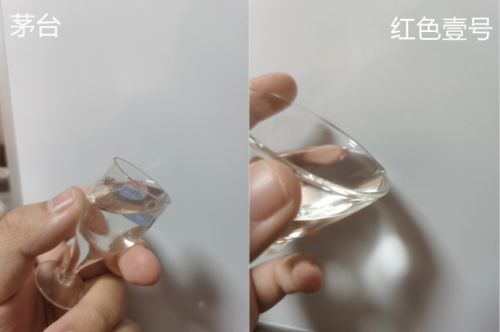我還自創(chuàng)了一個項目,就是盡量傾斜酒杯,因為貯藏時間越長的純糧酒的酒液張力大,到杯子邊上的時候會堆積起來,不會直接倒出去,茅臺我記得一年半起步,紅色壹號我問老板說兩三年。試了一下,確實不分伯仲,但是茅臺杯子邊窄,可能占點便宜。