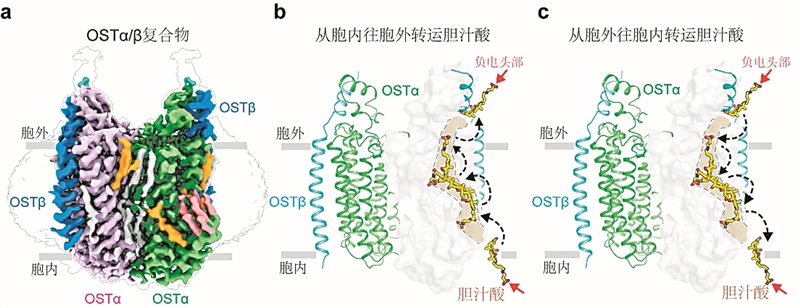“這種‘滑梯’機制極其巧妙。”姜道華說,它不需要腺嘌呤核苷三磷酸(ATP)或離子梯度等額外能量來驅(qū)動蛋白變形,只需利用膽汁酸自身的濃度差,就能實現(xiàn)高效雙向轉(zhuǎn)運。這完美解釋了OSTα/β作為被動轉(zhuǎn)運蛋白,為何能保證膽汁酸的高效回收。