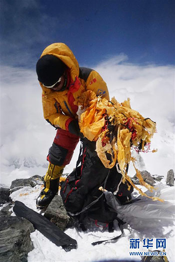 2018年5月,次仁旦達在珠穆朗瑪峰7500米的高度撿垃圾。 新華社發(fā)