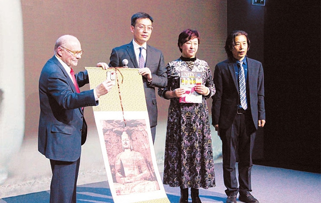 阿蘭·蓬皮杜先生接受大同市贈送非物質(zhì)文化遺產(chǎn)作品。本報通訊員攝
