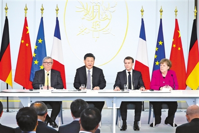 | 3月26日,國家主席習近平在巴黎同法國總統(tǒng)馬克龍一道出席中法全球治理論壇閉幕式。德國總理默克爾、歐盟委員會主席容克應(yīng)邀出席。 新華社記者 鞠 鵬攝 |