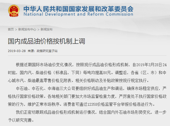人民網(wǎng)北京3月28日電 (王紹紹) 國家發(fā)改委剛剛發(fā)布通知, 根據(jù)近期國際市場油價變化情況,按照現(xiàn)行成品油價格形成機制,自2019年3月28日24時起,國內(nèi)汽、柴油價格(標準品,下同)每噸均提高80元。調(diào)整后,各省(區(qū)、市)和中心城市汽、柴油最高零售價格見附表。相關(guān)價格聯(lián)動及補貼政策按現(xiàn)行規(guī)定執(zhí)行。