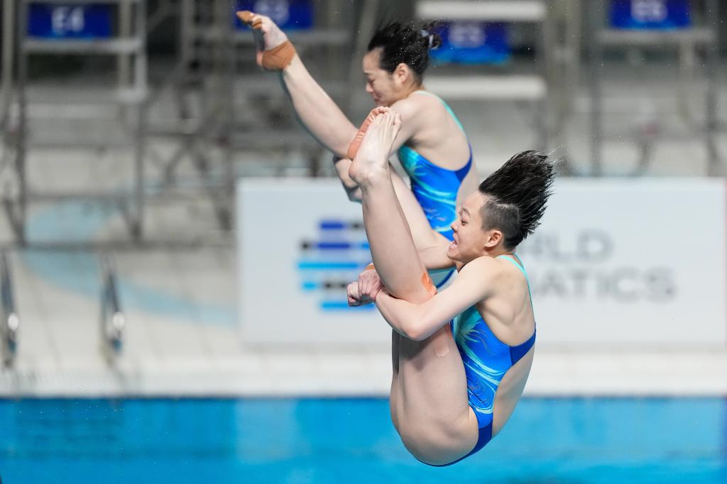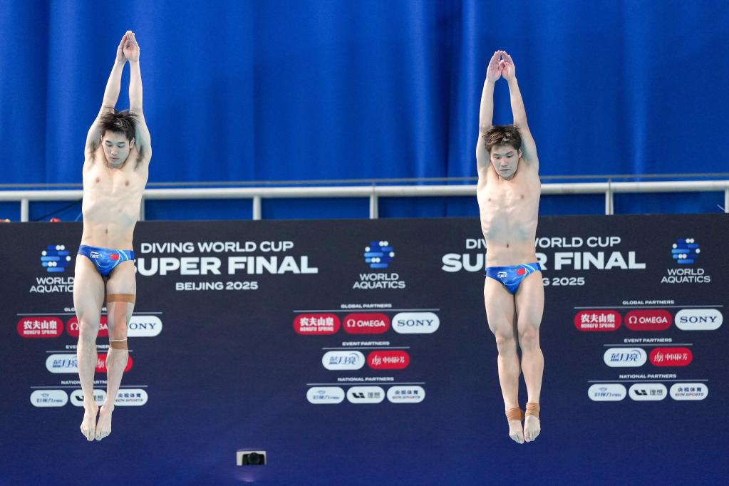 5月2日,胡宇康(左)/鄭九源在比賽中。新華社記者 鞠煥宗 攝 “在主場有這么多觀眾來看跳水比賽,我們也一定要做到最好,為觀眾奉獻一場精彩的表演?!编嵕旁丛谫惡笳f,“經(jīng)過今年前兩站世界杯的比賽,我們現(xiàn)在對彼此的節(jié)奏更熟悉了,也做出相應的調整,努力把動作做得更好,還是要一步一個腳印地前進。” 女子雙人3米板決賽中,奧運冠軍組合陳藝文/昌雅妮以323.13分的成績摘得桂冠,領先第二名澳大利亞組合基尼/克洛伊25.38分。英國組合哈珀/米尤-詹森收獲銅牌。