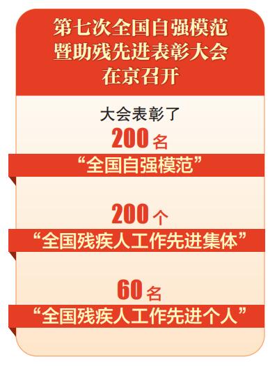 第七次全國自強模范暨助殘先進表彰大會16日在北京人民大會堂召開。200名全國自強模范、200個全國殘疾人工作先進集體和60名全國殘疾人工作先進個人受到表彰。
