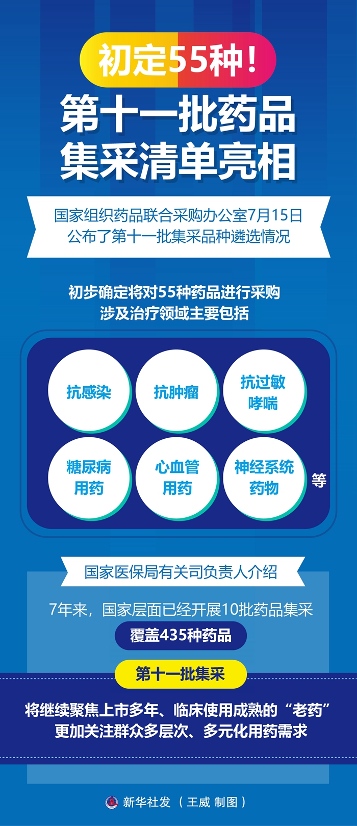 國家組織藥品聯(lián)合采購辦公室7月15日公布了第十一批集采品種遴選情況,初步確定將對55種藥品進(jìn)行采購,涉及治療領(lǐng)域主要包括抗感染、抗腫瘤、抗過敏哮喘、糖尿病用藥、心血管用藥、神經(jīng)系統(tǒng)藥物等。