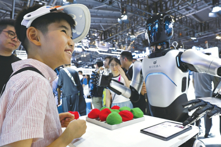 7月26日,小朋友在與機(jī)器人進(jìn)行游戲互動。當(dāng)日,2025世界人工智能大會暨人工智能全球治理高級別會議在上海開幕。本屆大會以“智能時代 同球共濟(jì)”為主題,包括會議論壇、展覽展示、賽事評獎、應(yīng)用體驗、創(chuàng)新孵化等五大板塊。