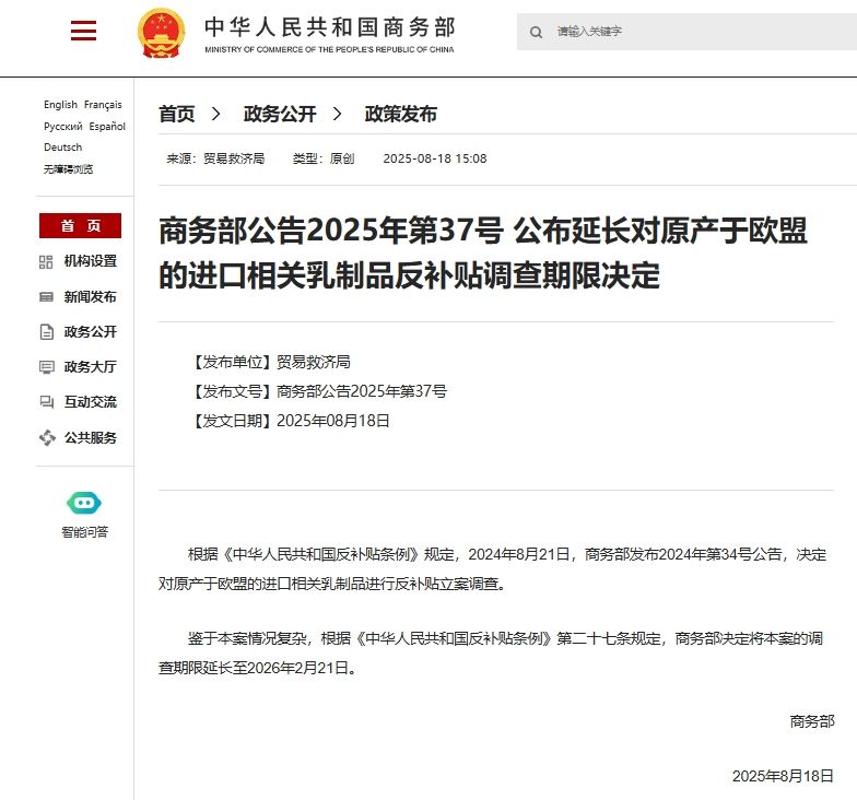 商務(wù)部公告2025年第37號(hào) 公布延長對(duì)原產(chǎn)于歐盟的進(jìn)口相關(guān)乳制品反補(bǔ)貼調(diào)查期限決定
