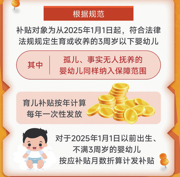 根據規(guī)范,補貼對象為從2025年1月1日起,符合法律法規(guī)規(guī)定生育或收養(yǎng)的3周歲以下嬰幼兒,其中,孤兒、事實無人撫養(yǎng)的嬰幼兒同樣納入保障范圍。育兒補貼按年計算,每年一次性發(fā)放。對于2025年1月1日以前出生、不滿3周歲的嬰幼兒,按應補貼月數(shù)折算計發(fā)補貼。