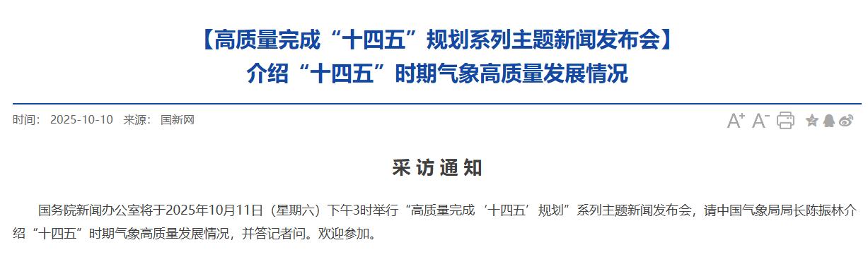 國務(wù)院新聞辦公室將于2025年10月11日(星期六)下午3時(shí)舉行“高質(zhì)量完成‘十四五’規(guī)劃”系列主題新聞發(fā)布會(huì),請中國氣象局局長陳振林介紹“十四五”時(shí)期氣象高質(zhì)量發(fā)展情況,并答記者問。