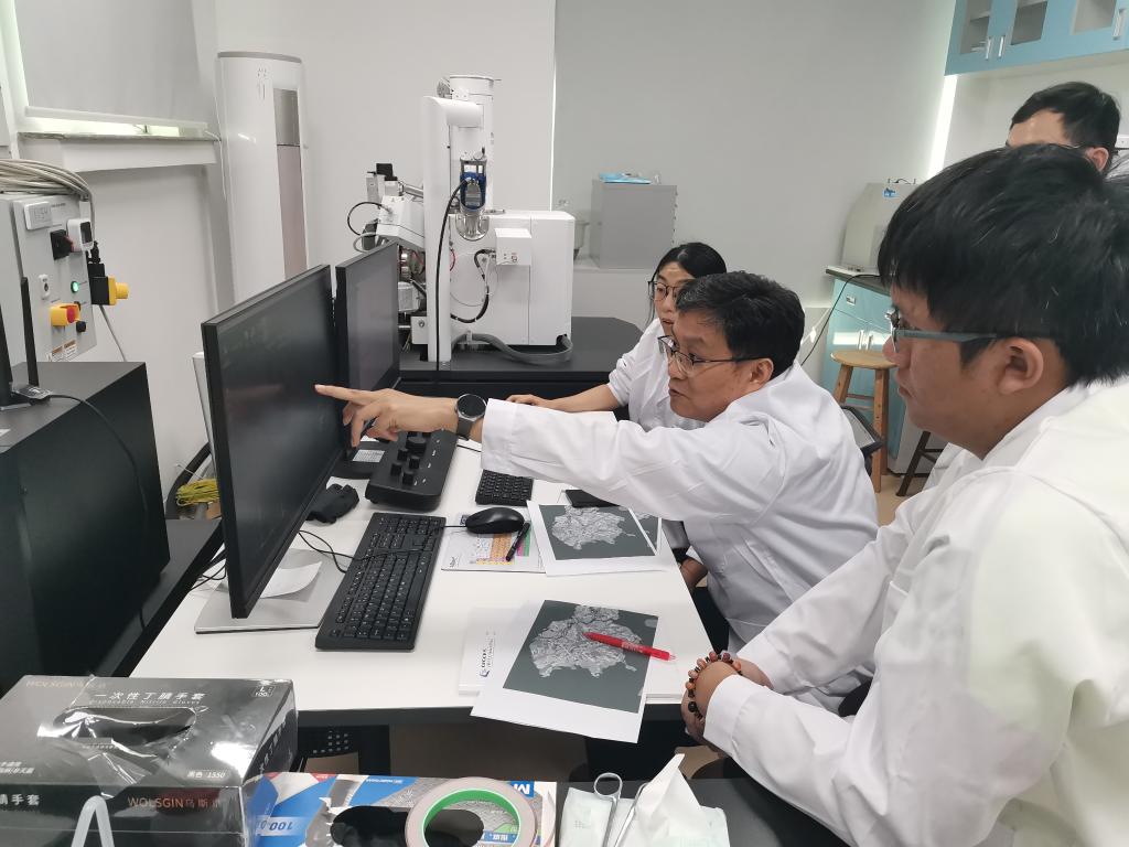 2024年8月26日,徐義剛院士與團(tuán)隊(duì)成員通過掃描電鏡觀察嫦娥六號(hào)樣品特征。(中國(guó)科學(xué)院廣州地球化學(xué)研究所供圖)