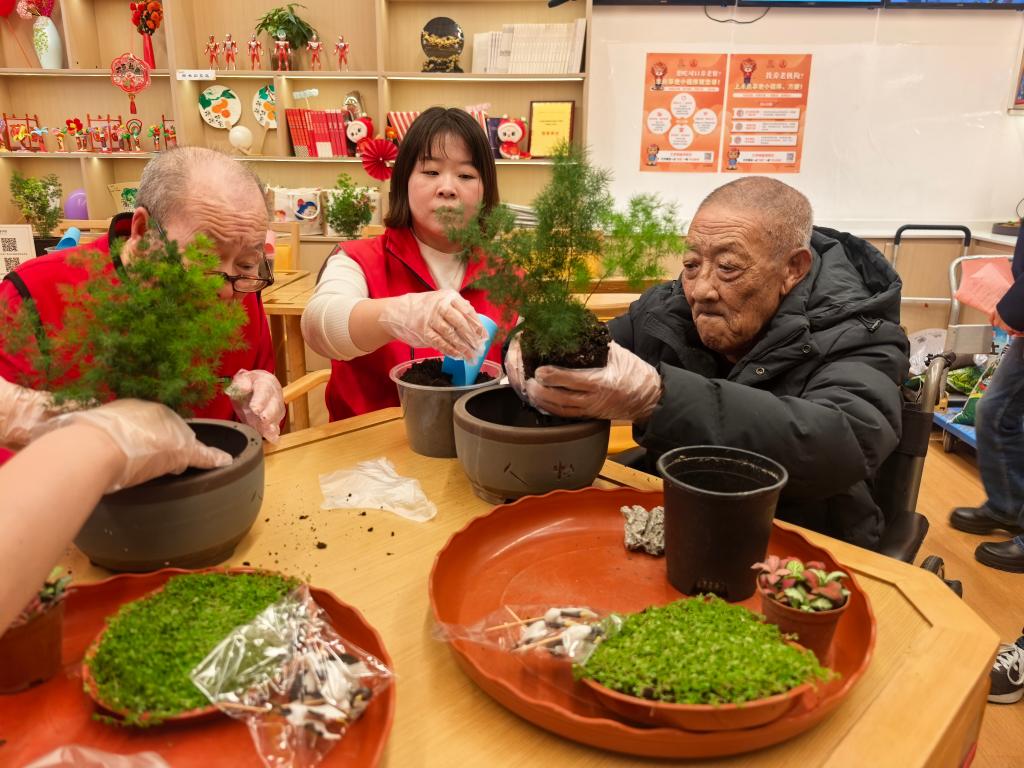 10月24日,在北京市豐臺區(qū)北宮鎮(zhèn)養(yǎng)老服務中心,志愿者正手把手教老人制作“松鶴延年”盆景。(新華社記者夏子麟 攝)