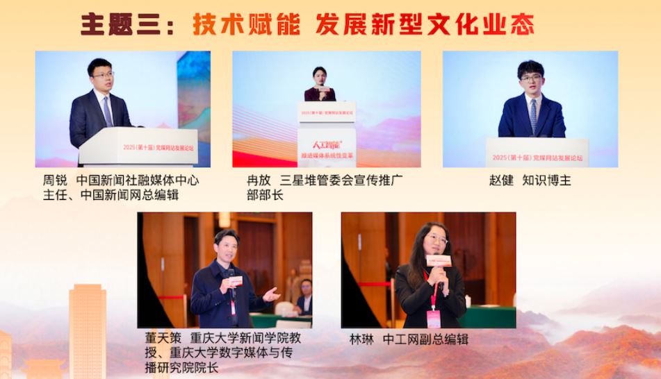 在“技術賦能 發(fā)展新型文化業(yè)態(tài)”主題研討環(huán)節(jié),中國新聞社融媒體中心主任、中國新聞網(wǎng)總編輯周銳,三星堆管委會宣傳推廣部部長冉放,知識博主趙健,分別就技術賦能中華文化“破圈”出海、三星堆文化傳播數(shù)智實踐、短視頻文化傳播等方面的經(jīng)驗成果進行了精彩展示。重慶大學新聞學院教授、重慶大學數(shù)字媒體與傳播研究院院長董天策,中工網(wǎng)副總編輯林琳作為互動嘉賓進行了點評,期待主流媒體發(fā)揮傳播實踐智慧,在內(nèi)容、技術和社會責任之間找到平衡,鑄造中華文化新輝煌。