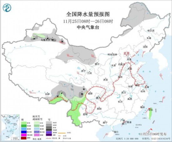 11月25日08時至26日08時,新疆沿天山地區(qū)和伊犁河谷、甘肅中北部、內蒙古東部和西部、黑龍江西北部、青海南部、西藏東部、西南地區(qū)北部等地部分地區(qū)有小雪或雨夾雪,其中,新疆沿天山地區(qū)和伊犁河谷、川西高原南部等地部分地區(qū)有中到大雪(5~9毫米)。西藏南部、四川南部、云南西部、臺灣島大部等地部分地區(qū)有小雨。新疆東部、內蒙古中西部、青海北部、甘肅、寧夏、遼東半島、山東半島、西藏北部等地部分地區(qū)有5~6級風、陣風7~9級;渤海、黃海、臺灣海峽、臺灣以東洋面、東海、南海等部分海域將有6~7級風、陣風8~10級。