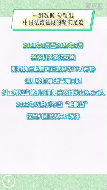 一組數(shù)據(jù),勾勒出中國法治建設(shè)的堅實足跡:2021年1月至2025年9月,檢察機關(guān)依法提出刑罰執(zhí)行監(jiān)督糾正意見等97.1萬件;清理收押難、送監(jiān)難問題,糾正判處監(jiān)禁刑罰罪犯未交付執(zhí)行9.6萬人;2022年以來對不當(dāng)“減假暫”提出糾正意見7.5萬件……