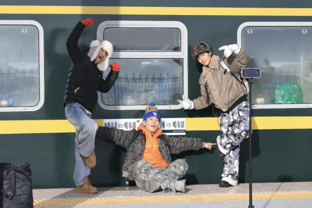 游客在漠河站站臺(tái)上與K7041次“雪國列車”合影留念。 新華社發(fā)(徐率攝)