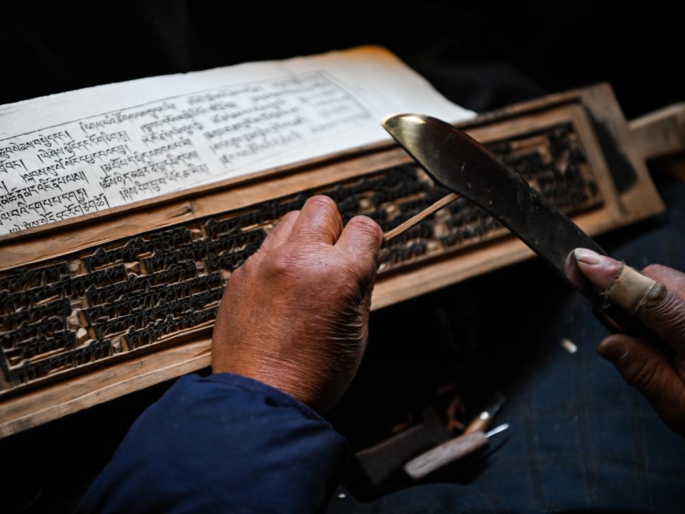 2024年11月2日,在德格印經(jīng)院,工人在制作院藏印版。新華社記者 王曦 攝