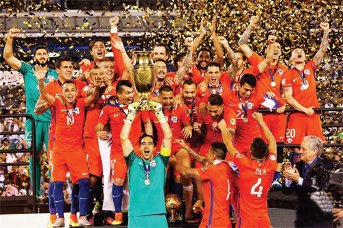 6月26日,智利隊(duì)門將布拉沃(前左一)在頒獎(jiǎng)儀式上捧杯慶祝奪冠。當(dāng)日,2016年百年美洲杯決賽在美國新澤西舉行,智利隊(duì)與阿根廷隊(duì)在120分鐘內(nèi)0比0戰(zhàn)平,智利隊(duì)在點(diǎn)球大戰(zhàn)中以4比2戰(zhàn)勝阿根廷隊(duì),奪得冠軍。 (責(zé)任編輯:武丹) |