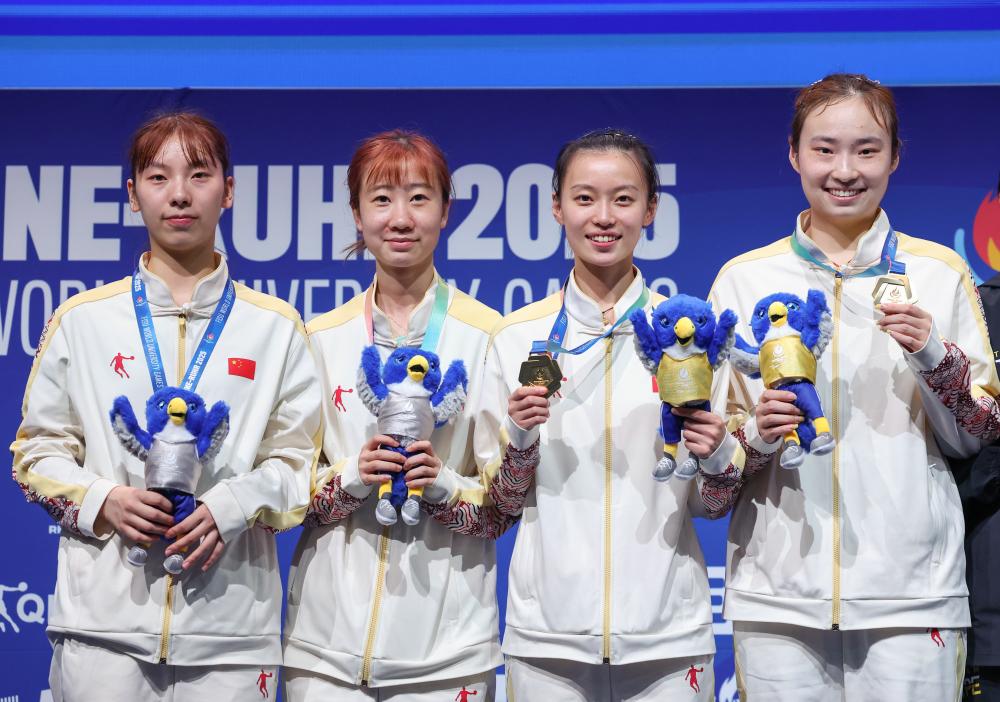 7月23日,冠軍中國隊選手穆文喆(中)、邢佳妮(左)和郭清在頒獎儀式上。新華社記者 李穎 攝