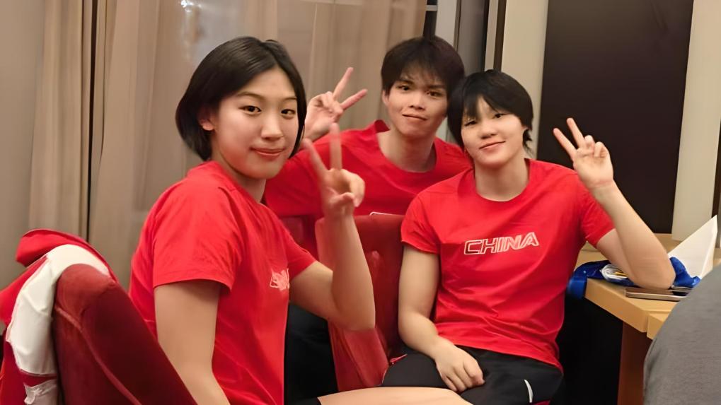 楊佩琪(右)、嚴(yán)窕珊(左)和徐海博(中)。中國(guó)游泳隊(duì)供圖