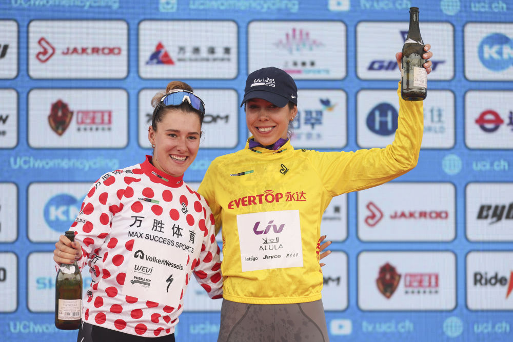 10月14日,身著代表爬坡總積分第一名的圓點(diǎn)衫的安妮·克妮珍寶(左)和身著代表個人總成績第一名的黃衫的貝克在頒獎儀式上慶祝。新華社記者 王翔 攝