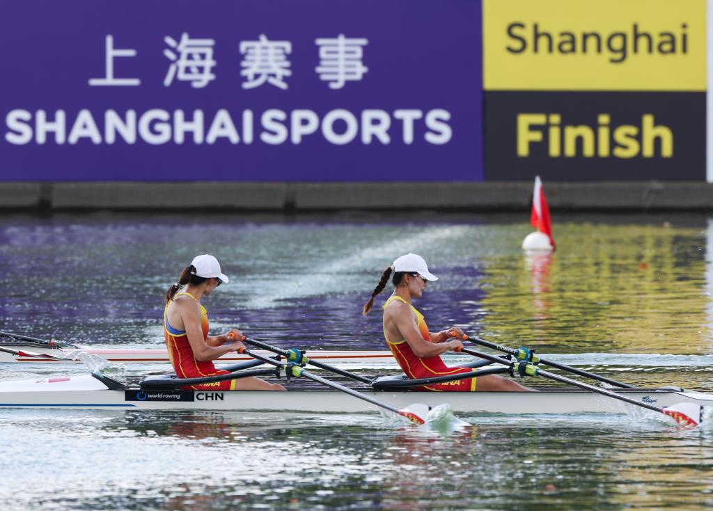 2025年9月26日,陳云霞(左)與張靈在比賽中。當(dāng)日,在上海舉行的2025年世界賽艇錦標(biāo)賽女子雙人雙槳A組決賽中,中國選手陳云霞/張靈斬獲銀牌。新華社記者 丁汀 攝