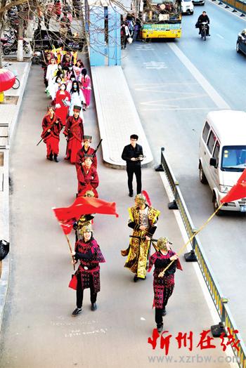 男的身披戰(zhàn)袍鎧甲,女的一襲古裝長裙,一支戰(zhàn)國時(shí)代的隊(duì)伍揮舞旗幟、佩帶長劍從忻州城區(qū)七一路走過?!笆遣皇桥碾娨晞×??”過往行人紛紛側(cè)目觀望。
