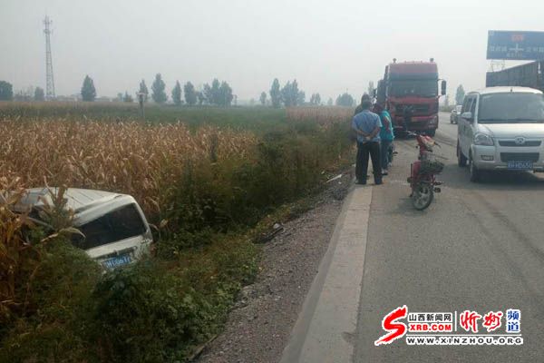 9月16日下午13時(shí)左右,在忻州東外環(huán)108國道北肖村段,一輛大貨車發(fā)生追尾,將路邊停放的面包車撞到了溝里,所幸車內(nèi)無人,未造成人員傷亡。(韓偉)