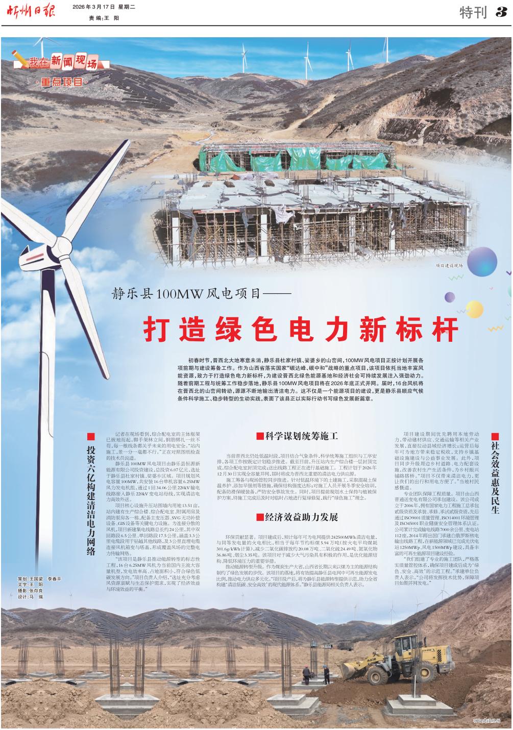 “該項目是靜樂縣推動能源轉(zhuǎn)型的標(biāo)志性工程,16臺6.25MW風(fēng)機(jī)為當(dāng)前國內(nèi)主流大容量機(jī)型,發(fā)電效率高、占地面積小,符合綠色低碳發(fā)展方向?!表椖控?fù)責(zé)人介紹,“選址充分考慮風(fēng)資源稟賦與生態(tài)保護(hù)需求,實現(xiàn)了經(jīng)濟(jì)效益與環(huán)境效益的平衡?!?/p>