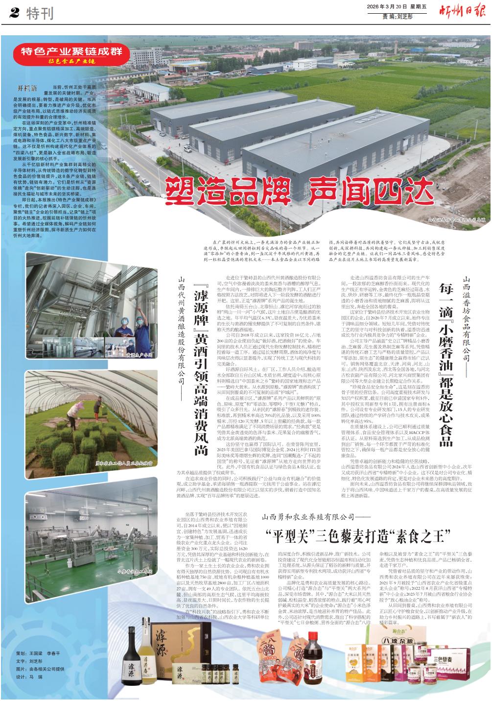 在廣袤的忻州大地上,一條充滿活力的食品產(chǎn)業(yè)鏈正加速形成,串聯(lián)起從田間耕耘到舌尖品味的每一個環(huán)節(jié)。從一滴“零添加”的小磨香油,到一盞沉淀千年風(fēng)雅的代州黃酒,再到一粒粒晶瑩飽滿的有機大米……本土食品企業(yè)以不同的路徑,共同詮釋著對品質(zhì)的執(zhí)著堅守。它們或堅守古法,或銳意創(chuàng)新,或深耕科技,共同構(gòu)建起一條從種植、加工到銷售深度融合的完整產(chǎn)業(yè)鏈。讓我們一同品味三晉風(fēng)味,感受特色食品產(chǎn)業(yè)在這片土地上書寫的高質(zhì)量發(fā)展新篇章。 山西代州黃酒釀造股份有限公司——“滹源牌”黃酒引領(lǐng)高端消費風(fēng)尚 走進位于繁峙縣的山西代州黃酒釀造股份有限公司,空氣中彌漫著淡淡的黍米焦香與酒糟的醇厚氣息。生產(chǎn)車間內(nèi),一排排巨大的陶壇整齊列陣,工人們正嚴格按照古法技藝,對即將進入下一階段發(fā)酵的酒醅進行開耙。這里,正是“滹源牌”系列產(chǎn)品的誕生地。 依托南倚五臺山、北靠恒山、滹沱河穿流而過的獨特“兩山一川一河”小氣候,這片土地自古便是釀酒的優(yōu)選之地。年平均氣溫僅6.3℃,晝夜溫差大,為優(yōu)質(zhì)黍米的生長與黃酒的慢發(fā)酵提供了不可復(fù)制的自然條件,堪稱天然的釀酒福地。 公司自2018年成立以來,這家投資10億元、占地200畝的企業(yè)便肩負起“做好酒,把酒做好”的使命。車間里的技術(shù)人員正通過現(xiàn)代生物發(fā)酵控制技術(shù),精準把控著每一道工序。通過延長發(fā)酵周期,酒體的純凈度與風(fēng)味層次得以顯著提升,實現(xiàn)了傳統(tǒng)工藝與現(xiàn)代科技的完美融合。 好酒源自好風(fēng)土。在廠區(qū),工作人員介紹,釀造用水全部取自五臺山區(qū)域,水質(zhì)甘冽,硬度適中;而核心原料則精選自“中國黍米之鄉(xiāng)”繁峙的國家地理標志產(chǎn)品——繁峙大黃米。從水源到原糧,“滹源牌”黃酒構(gòu)筑了從田間到餐桌的不可復(fù)制的品質(zhì)“護城河”。 在成品展示區(qū),“滹源牌”系列產(chǎn)品以其鮮明的“原色、原味、原度”和“零添加、零嘌呤、干型(無糖)”特點,吸引了眾多目光。從親民的“滹源春”到精致的迷你裝、標準款,再到精米率高達70%的禮品裝,以及采用100%精米、歷經(jīng)120天發(fā)酵、5年以上窖藏的經(jīng)典款,每一款產(chǎn)品都精準滿足了不同消費場景的需求。“經(jīng)典款”更是憑借其金黃透亮的色澤與黍米、花果復(fù)合的幽雅香氣,成為北派高端黃酒的典范。 這份堅守也贏得了國際認可。在榮譽陳列室里,2023年美國巴拿馬國際博覽會金獎、2024比利時ITI國際美味獎等熠熠生輝的獎牌,連同“國潮甄選·了不起的國貨”的稱號,見證著“滹源牌”從地方走向世界的步伐。此外,中國有機食品認證與綠色食品A級認證,也為其卓越品質(zhì)提供了權(quán)威背書。 在追求商業(yè)價值的同時,公司積極踐行“公益與商業(yè)有機融合”的價值觀,成立助學(xué)基金,承諾每銷售一瓶酒提取一元錢用于公益事業(yè)。站在滹沱河畔,山西代州黃酒釀造股份有限公司正以堅實的步伐,朝著打造中國知名黃酒品牌、實現(xiàn)“百年品牌傳承”的愿景邁進。 山西溢香坊食品有限公司——每一滴“小磨香油”都是放心食品 走進山西溢香坊食品有限公司的生產(chǎn)車間,一股濃郁的芝麻醇香撲面而來?,F(xiàn)代化的生產(chǎn)線正有序運轉(zhuǎn),金黃色的芝麻經(jīng)過篩選、水洗、烘炒、研磨等工序,最終化作一瓶瓶晶瑩剔透的小磨香油和質(zhì)地細膩的芝麻醬,即將從這里出發(fā),奔赴全國各地的餐桌。 這家位于繁峙縣經(jīng)濟技術(shù)開發(fā)區(qū)農(nóng)業(yè)生物園區(qū)的企業(yè),自2020年7月成立以來,始終專注于調(diào)味品細分領(lǐng)域。短短幾年間,憑借對傳統(tǒng)工藝的堅守與對科技創(chuàng)新的執(zhí)著,溢香坊迅速成長為行業(yè)內(nèi)極具競爭力的“專精特新”企業(yè)。 公司主導(dǎo)產(chǎn)品涵蓋“史立江”牌精品小磨香油、芝麻醬、花生醬及熟制芝麻等系列,憑借精湛的傳統(tǒng)石磨工藝與嚴格的質(zhì)量管控,產(chǎn)品以“零添加、原生態(tài)”的健康理念贏得市場廣泛認可。銷售網(wǎng)絡(luò)覆蓋北京、天津、河南、河北、山東、山西、陜西及東北、西北等全國各地,與河北古松農(nóng)副產(chǎn)品有限公司、河北家興商貿(mào)集團有限公司等大型企業(yè)建立長期穩(wěn)定合作關(guān)系。 “珍視食品安全如生命”,這是刻在溢香坊骨子里的經(jīng)營信條。公司高度重視技術(shù)研發(fā)與知識產(chǎn)權(quán)積累,截至目前已申請國家專利5件,其中授權(quán)實用新型專利1項,擁有注冊商標6件。公司設(shè)有專業(yè)研發(fā)部門,15人的專業(yè)研發(fā)團隊通過持續(xù)的產(chǎn)學(xué)研合作與技術(shù)攻關(guān),成果轉(zhuǎn)化率高達95%。 在質(zhì)量體系建設(shè)上,公司已順利通過質(zhì)量管理體系、食品安全管理體系以及HACCP體系認證。從原料篩選到生產(chǎn)加工,從成品檢測到出廠銷售,每一個環(huán)節(jié)都置于嚴苛的標準化管控之下,確保每一瓶產(chǎn)品都是安全放心的健康食品。 憑借卓越的創(chuàng)新能力和穩(wěn)健的經(jīng)營戰(zhàn)略,山西溢香坊食品有限