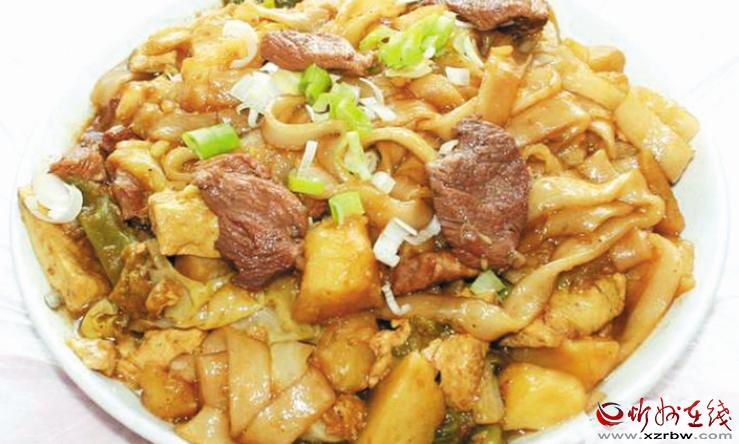 豆面稍加白面制成的豆面河撈是五寨當(dāng)?shù)氐奶厣s糧主食,經(jīng)特制的河撈床下到鍋里,待面壓到一定長度,截?cái)嗝鏃l,煮熟后配上各種澆頭,吃著筋滑利口。(張志遠(yuǎn))