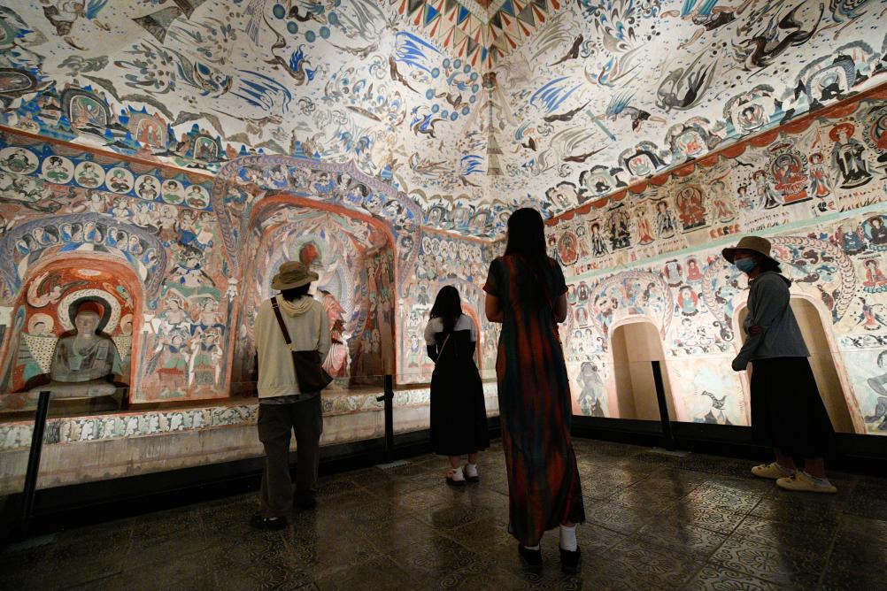 2024年6月7日,在敦煌石窟文物保護(hù)研究陳列中心,游客參觀莫高窟復(fù)制洞窟第276窟壁畫。新華社記者 郎兵兵 攝