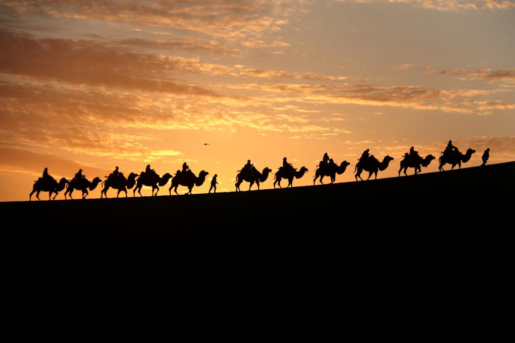 月牙泉是沙漠的眼睛,依舊倒映著漢唐的明月。駝隊(duì)曾經(jīng)從這里經(jīng)過,駝鈴聲串起長(zhǎng)安與羅馬的夢(mèng)。絲綢是流動(dòng)的彩虹,瓷器是凝固的月光,經(jīng)卷里藏著智慧的種子,在歐亞大陸上生根發(fā)芽。