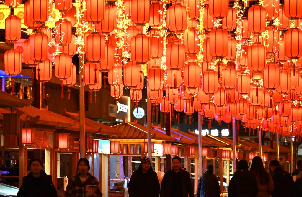 2025年1月27日晚,游客在甘肅省敦煌夜市游覽。張曉亮 攝
