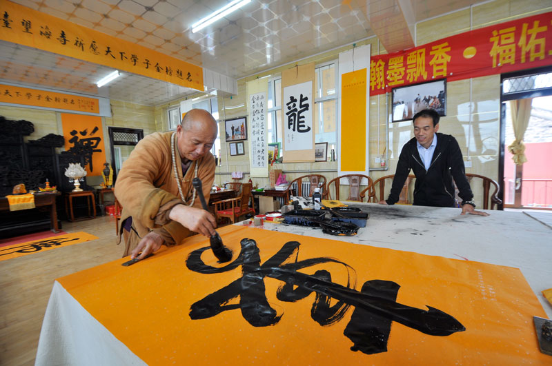 29日,中國佛教講經(jīng)交流會在五臺山召開之際,記者走訪了東臺頂望海寺釋覺一法師,他在勤修佛法的同時在書畫藝術(shù)上也自成一家。他認為,佛法與書畫關(guān)系密切相通之處,學習佛法可促進書法境界的提升,有助于佛法的弘揚。