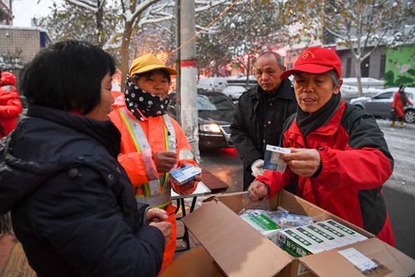 圖說:蔣愛榮(右一)為環(huán)衛(wèi)工人分發(fā)愛心人士捐贈的感冒藥(11月23日攝)。圖片來源:新華社