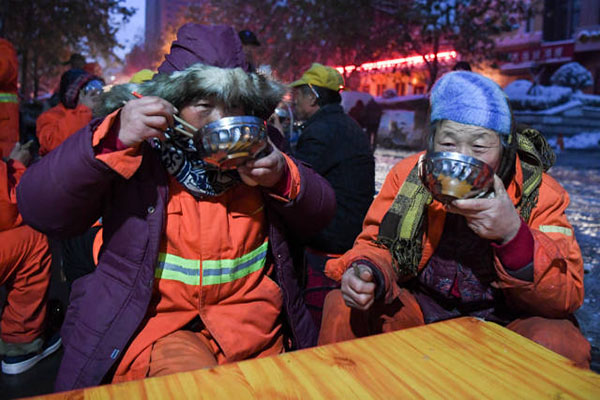 百度貼吧網(wǎng)友“馬克斯基”說:“下雪天路過鄭州廣電南路愛心粥屋,寒風(fēng)中200多位環(huán)衛(wèi)工人圍坐在一起喝著熱騰騰的粥,有說有笑,我流淚了。此刻,愛心粥屋就是我們‘城市美容師’的家?!?/p>
