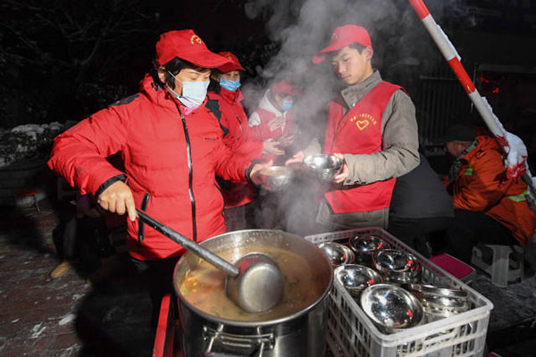 圖說:在鄭州市廣電南路愛心粥屋,志愿者在為環(huán)衛(wèi)工人分發(fā)早餐(11月23日攝)。圖片來源:新華社