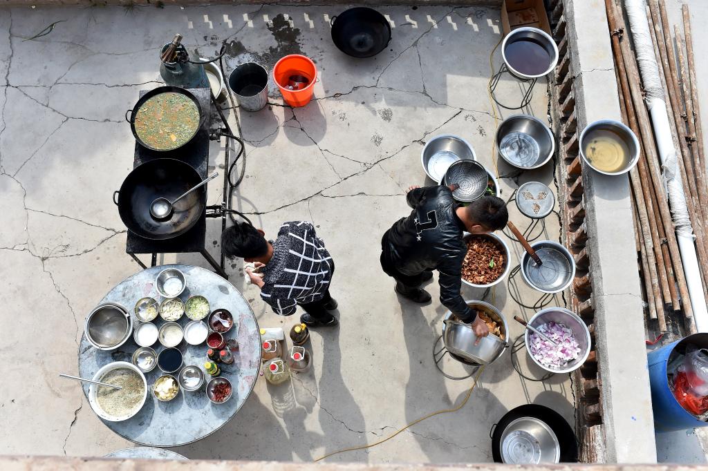 ↑在山西省壺關(guān)縣五龍山鄉(xiāng)水池村,村民請(qǐng)來(lái)的廚師在為重陽(yáng)節(jié)老人宴會(huì)準(zhǔn)備菜品(10月13日攝)。