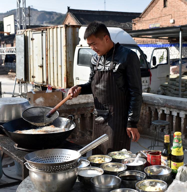 ↑在壺關(guān)縣五龍山鄉(xiāng)水池村,村民請(qǐng)來(lái)的廚師在為重陽(yáng)節(jié)老人宴會(huì)準(zhǔn)備菜品(10月13日攝)。
