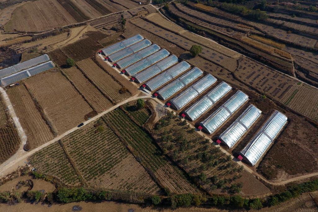 ↑壺關(guān)縣五龍山鄉(xiāng)水池村的蔬菜大棚(10月12日無(wú)人機(jī)拍攝)。