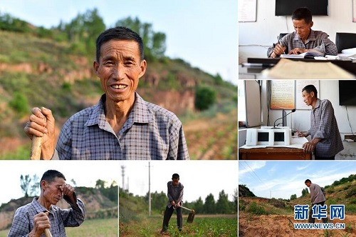 董留照,男,1949年出生,山西省長治市武鄉(xiāng)縣韓道溝村人,現(xiàn)任韓道溝村黨支部書記。近年來,董留照帶領(lǐng)村民大力發(fā)展梅杏種植、家禽養(yǎng)殖,改善村容村貌。2018年,韓道溝村實(shí)現(xiàn)整村脫貧,村民年人均收入達(dá)到4500多元。 左上:董留照肖像;右上:董留照在村委會整理材料;右中:董留照在村委會通過廣播向村民宣傳農(nóng)業(yè)政策;右下:董留照在地里松土;下中:董留照在地里忙碌;下左:董留照擦拭額頭上的汗水(拼版照片,6月10日攝)。 地處晉東南的山西省長治市,位于由太行山、太岳山環(huán)繞而成的上黨盆地中。在群山中、崖壁上,許多村莊自然條件惡劣,基礎(chǔ)設(shè)施落后,脫貧致富是大山深處人們的迫切心愿。 近年來,一場場脫貧攻堅(jiān)戰(zhàn),在一個(gè)個(gè)深山村打響。政府全力探索脫貧路徑的同時(shí),山區(qū)百姓因地制宜,靠自己的雙手和智慧走上致富路,交出了一份扎實(shí)的脫貧答卷。 記者在太行山、太岳山一路尋訪,記錄下多位70歲老人的生活。這些共和國的同齡人,親歷了山鄉(xiāng)的巨變,見證著長治山區(qū)脫貧攻堅(jiān)偉大工程的一步步推進(jìn)。 新華社記者 詹彥 攝