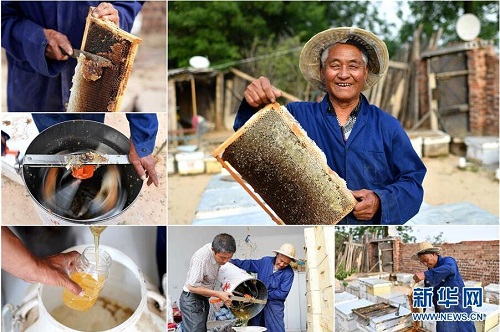 王巨才,男,1949年出生,山西省長治市武鄉(xiāng)縣鳳臺坪村人,2014年被列入建檔立卡貧困戶。2016年,在當(dāng)?shù)卣膸椭?,王巨才和兒子一起學(xué)習(xí)養(yǎng)蜂技術(shù),發(fā)展養(yǎng)蜂產(chǎn)業(yè)。2018年,王巨才銷售蜂蜜收入達(dá)到4萬多元。 右上:王巨才肖像;左上:王巨才在去除蜂板上的蜂蠟;左中:王巨才使用搖蜜機(jī)取蜜;左下:王巨才將蜂蜜裝到瓶子里;下中:王巨才(右)和兒子將搖蜜機(jī)里的蜜倒出;下右:王巨才在整理蜂箱(拼版照片,6月11日攝)。 地處晉東南的山西省長治市,位于由太行山、太岳山環(huán)繞而成的上黨盆地中。在群山中、崖壁上,許多村莊自然條件惡劣,基礎(chǔ)設(shè)施落后,脫貧致富是大山深處人們的迫切心愿。 近年來,一場場脫貧攻堅戰(zhàn),在一個個深山村打響。政府全力探索脫貧路徑的同時,山區(qū)百姓因地制宜,靠自己的雙手和智慧走上致富路,交出了一份扎實(shí)的脫貧答卷。 記者在太行山、太岳山一路尋訪,記錄下多位70歲老人的生活。這些共和國的同齡人,親歷了山鄉(xiāng)的巨變,見證著長治山區(qū)脫貧攻堅偉大工程的一步步推進(jìn)。 新華社記者 詹彥 攝