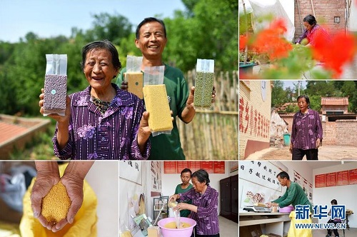 張成華,女,1949年出生,山西省長治市武鄉(xiāng)縣嶺頭村人。近年來,嶺頭村在縣里有關(guān)部門的扶持下,對村民開展電商培訓(xùn)。村民們嘗試著在手機(jī)上“開店”,把小米、核桃、綠豆等農(nóng)產(chǎn)品在網(wǎng)絡(luò)上售賣。張成華的兒子魏寶玉開了網(wǎng)店后,自家的農(nóng)產(chǎn)品在網(wǎng)上銷售良好,家庭收入明顯增加。 左上:張成華(前)和兒子魏寶玉展示自家種的農(nóng)產(chǎn)品;右上:張成華在家中院子里收拾;右中:張成華走在村里的路上;右下:張成華的兒子魏寶玉將準(zhǔn)備發(fā)貨的農(nóng)產(chǎn)品進(jìn)行稱重;下中:張成華(前)將小米裝袋;下左:張成華在查看小米質(zhì)量(拼版照片,6月12日攝)。 地處晉東南的山西省長治市,位于由太行山、太岳山環(huán)繞而成的上黨盆地中。在群山中、崖壁上,許多村莊自然條件惡劣,基礎(chǔ)設(shè)施落后,脫貧致富是大山深處人們的迫切心愿。 近年來,一場場脫貧攻堅(jiān)戰(zhàn),在一個(gè)個(gè)深山村打響。政府全力探索脫貧路徑的同時(shí),山區(qū)百姓因地制宜,靠自己的雙手和智慧走上致富路,交出了一份扎實(shí)的脫貧答卷。 記者在太行山、太岳山一路尋訪,記錄下多位70歲老人的生活。這些共和國的同齡人,親歷了山鄉(xiāng)的巨變,見證著長治山區(qū)脫貧攻堅(jiān)偉大工程的一步步推進(jìn)。 新華社記者 詹彥 攝