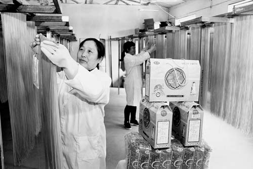 7月20日,工人正在晾曬生產(chǎn)出的“河撈面”。始制于北宋年間的五臺縣民間美食“河撈面”,如今又被該縣豆村鎮(zhèn)列為產(chǎn)業(yè)扶貧項(xiàng)目。在當(dāng)?shù)?,一個由興坪村“霞輝”玉米加工專業(yè)合作社生產(chǎn)出的玉米、高粱、蕎麥、大豆等12類盒裝與袋裝產(chǎn)品,已俏銷太原、忻州等食品市場,年產(chǎn)值達(dá)56萬元。(金俊賢 攝)