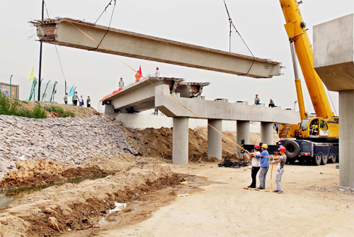 牧馬河橋施工現(xiàn)場。(智芝龍 趙曉煒 攝) 本報(bào)訊(記者 張樹彬)記者6月28日在忻州城區(qū)勝利路南延牧馬河畔看到,正在建設(shè)的牧馬河大橋雄姿初顯,一個個巨大的橋墩昂然矗立在牧馬河兩岸之間,長約140米,好似一條條巨大的臂膀托起正在架設(shè)延伸的橋面。據(jù)介紹,目前大橋主橋箱梁結(jié)構(gòu)的橋面架設(shè)已過半,有望在本周實(shí)現(xiàn)合龍。 據(jù)了解,牧馬河大橋自開工以來,承擔(dān)大橋施工任務(wù)的太原市政總公司的建設(shè)者們?yōu)楸4髽蚰馨磿r、按質(zhì)、按量建成而日夜奮戰(zhàn),每天投入100多個工人,分“ 三班”倒施工。據(jù)介紹,目前,大橋進(jìn)入橋面鋪設(shè)階段,工人們每天幾乎進(jìn)行的是水、陸、空立體施工。從25日一早開始,1臺大型拖車將1公里外預(yù)制的箱梁運(yùn)來,1臺大型吊車每天張開巨大吊臂在高空輸送箱梁,每個箱梁長為20米、重約60噸,整個橋面共由70塊箱梁組成。據(jù)現(xiàn)場施工技術(shù)人員介紹,過去的牧馬河橋長130米,寬僅有8.5米,嚴(yán)重制約著南北向車輛通行。新建的大橋長為140米,7跨30米寬,設(shè)計(jì)為雙向四車道。 牧馬河大橋合龍?jiān)诩矗瑥膭倮吠ㄏ蚰贤猸h(huán)將更加通暢。 (責(zé)任編輯:籍俊霞) |