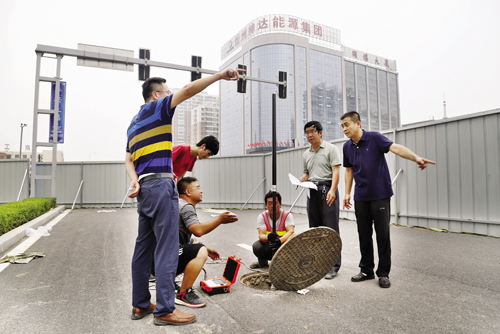 圖為技術(shù)人員現(xiàn)場檢測分析塌陷原因